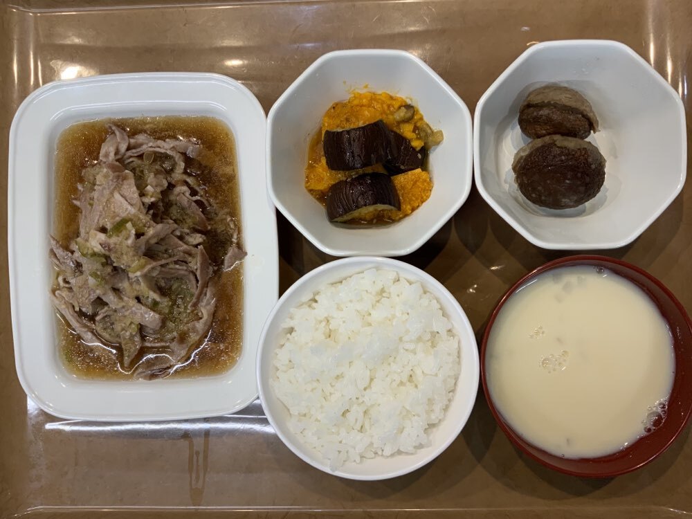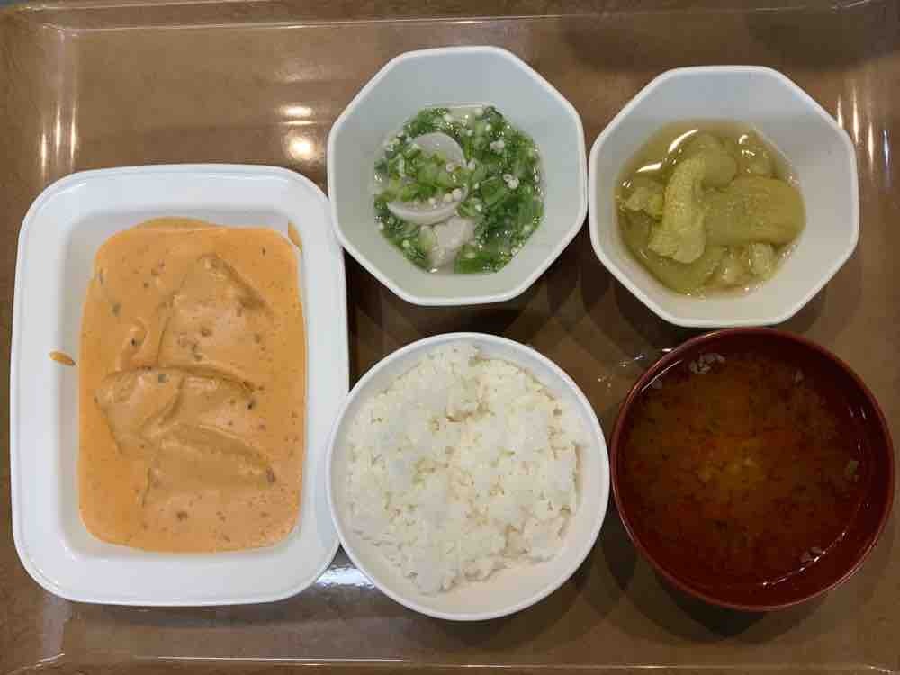 7月昼食「国産牛コマ肉椎茸クリーム煮ブイヨンチキン風味」