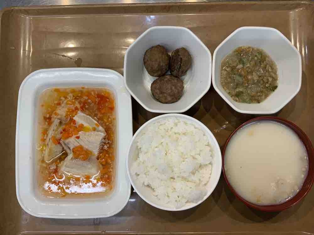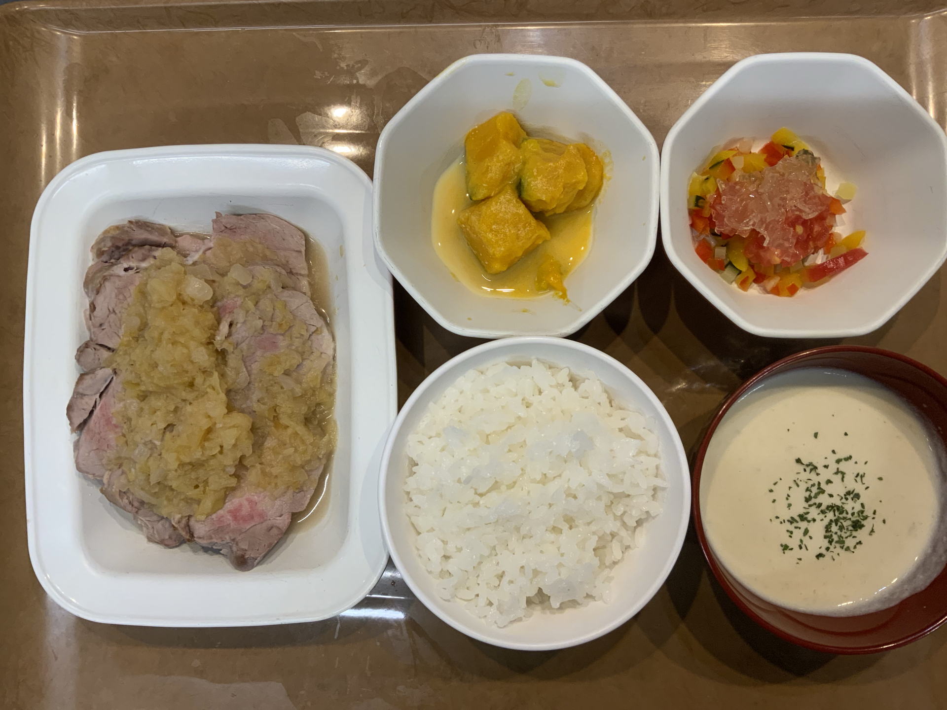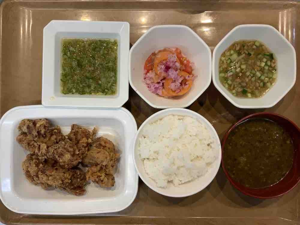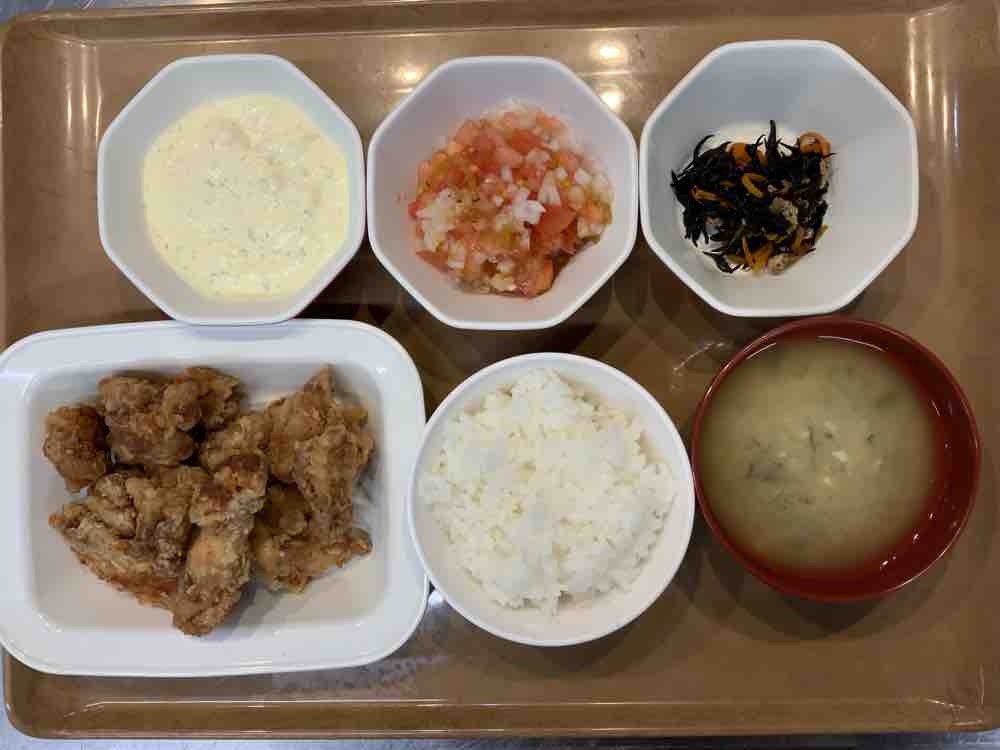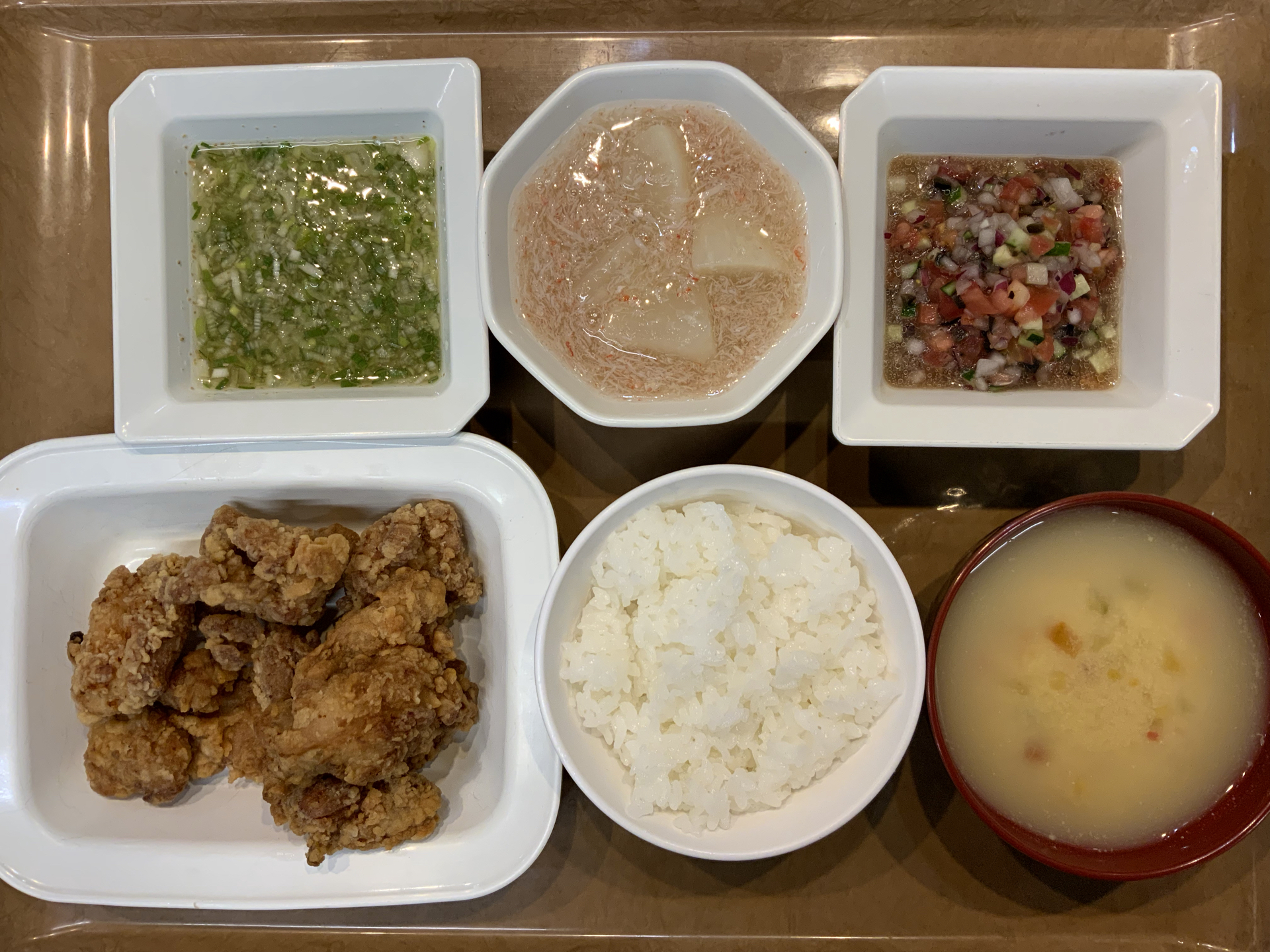 5月昼食「唐揚げ緑黄色野菜レムラードソース」