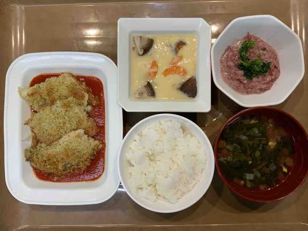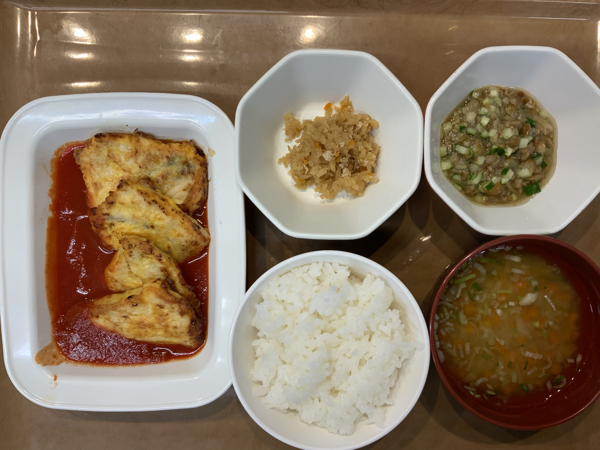 5月昼食「奥三河鶏ももソテー トマトチーズ添え」