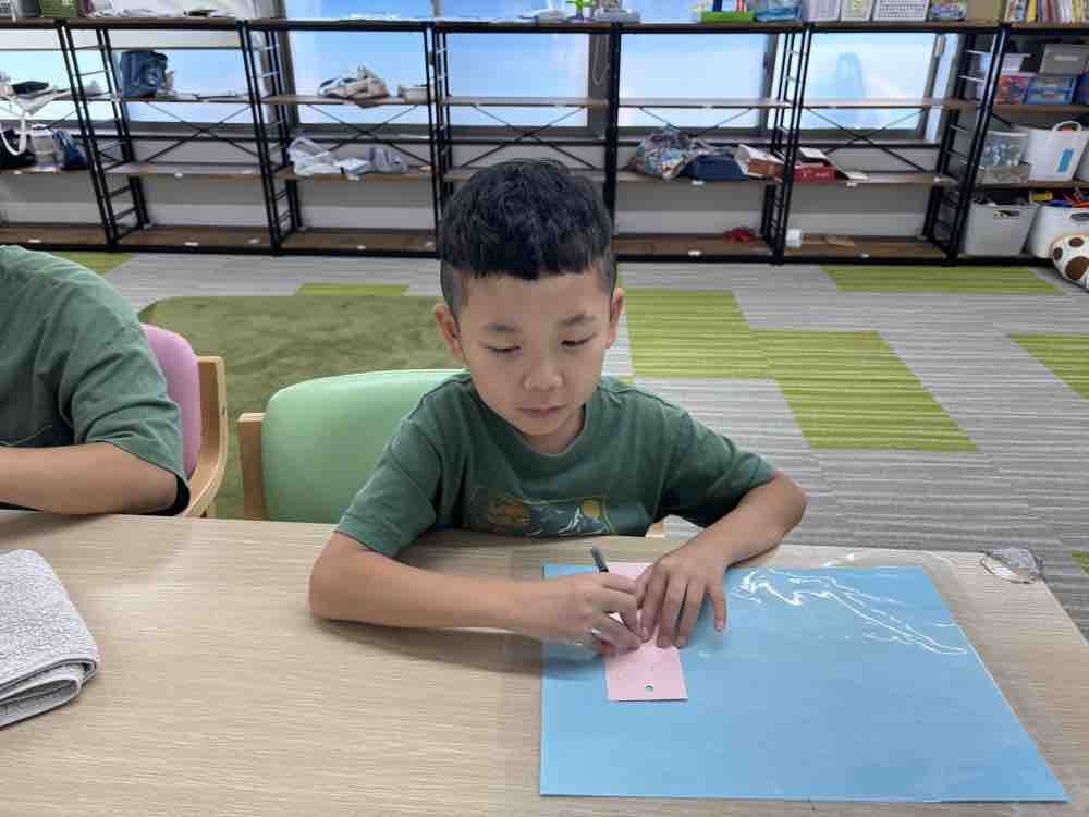 うちわを作ろう 上手に貼れるかな?